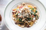 Whole-wheat spaghetti, roasted beets, spinach, sundried tomatoes, goat cheese, walnuts.