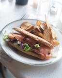 Grilled salmon, arugula, tomato, chive lemon oil dressing, piadina bread.